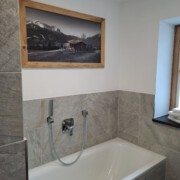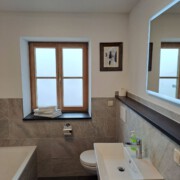 - Bad mit Wanne, Duschkabine, WC, Handtuchtrockner und Föhn